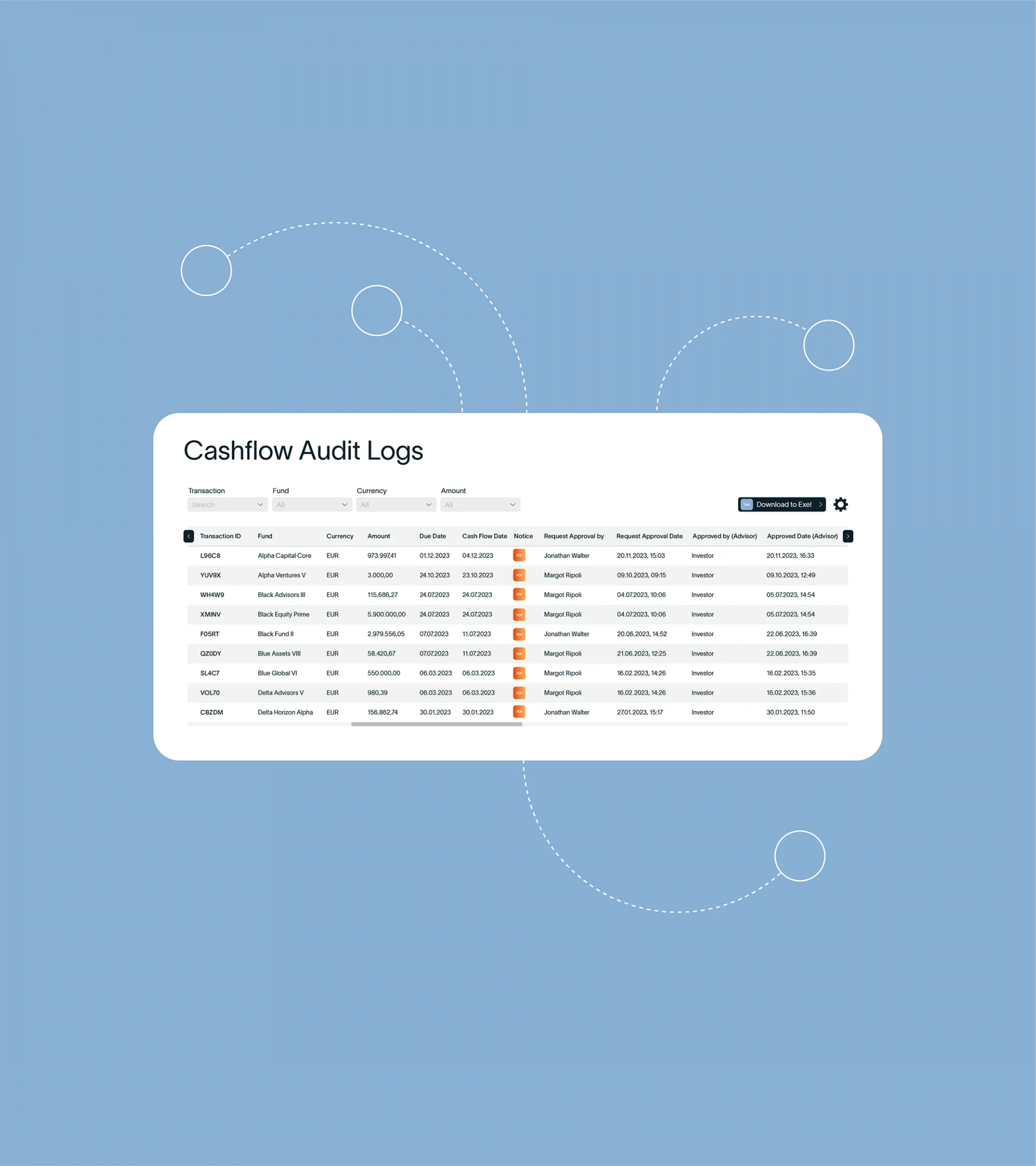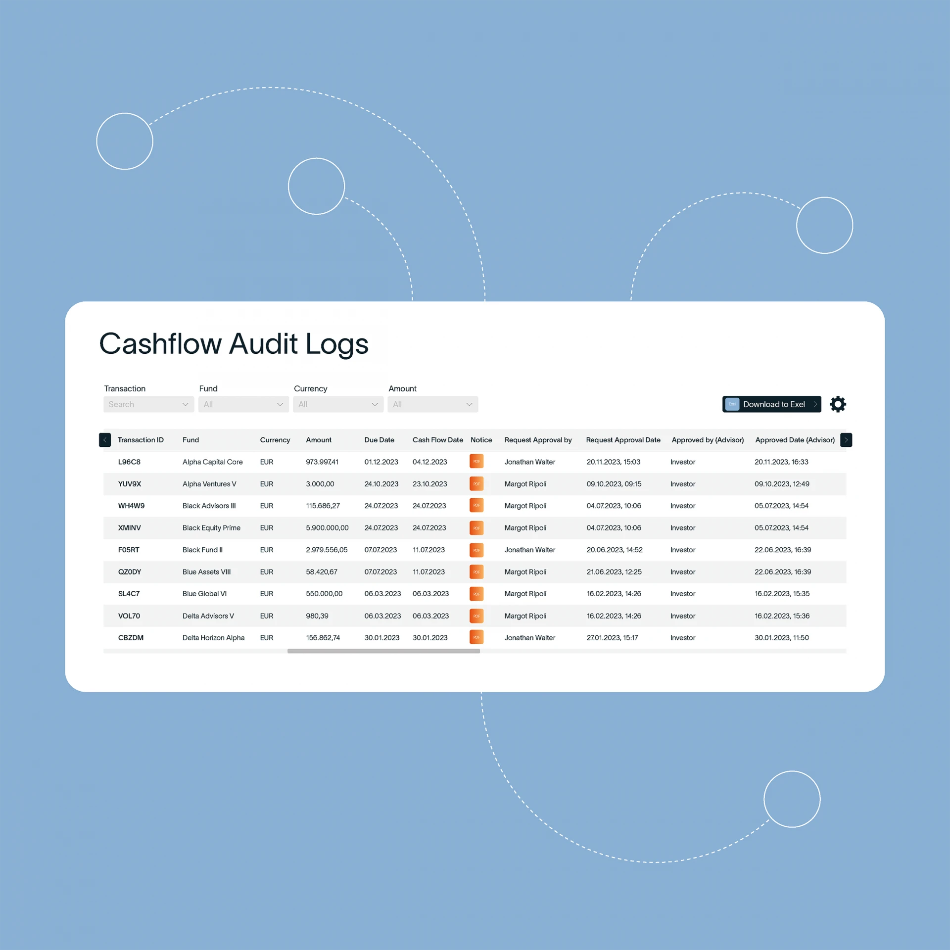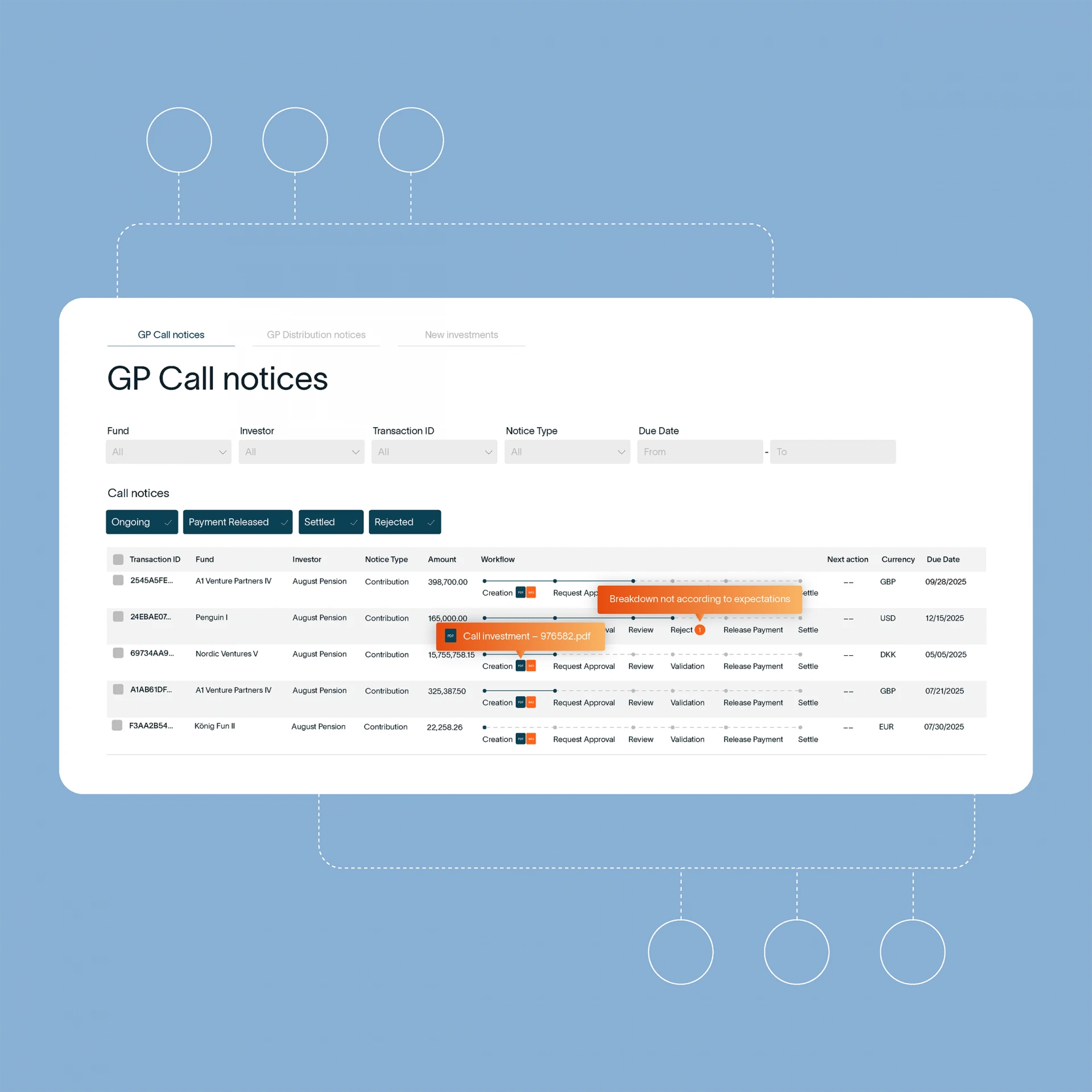 Digitize approval processes and tasks. For example, capital call notices are reviewed and approved through a configurable workflow in the platform, with designated roles and four-eyes checks. Workflows are tailored to your governance, ensuring compliance and speed.